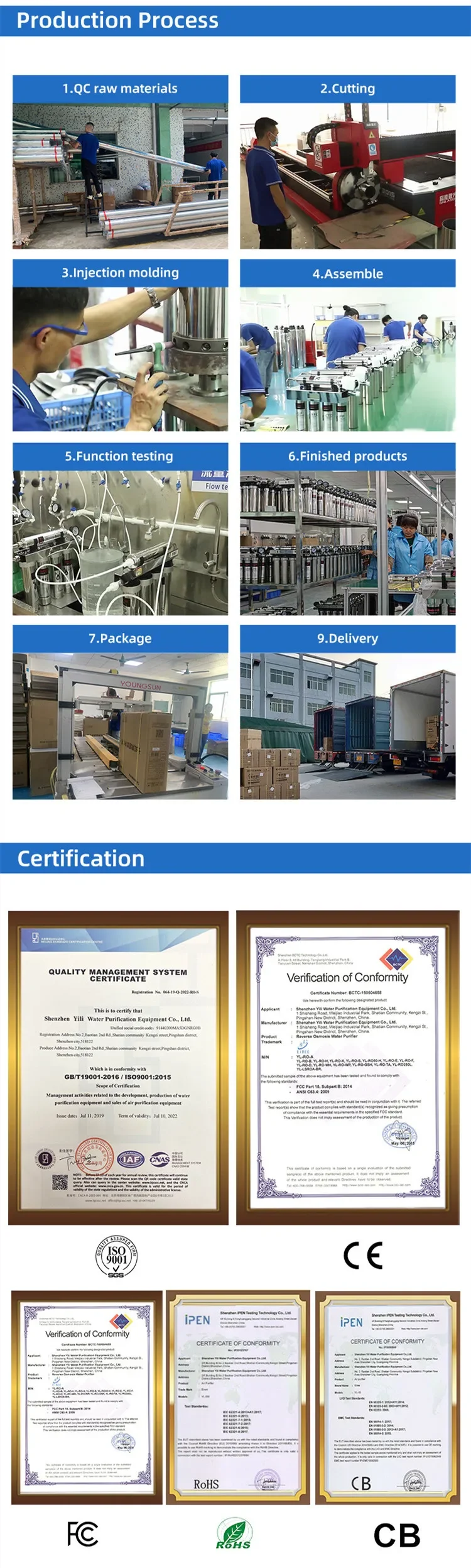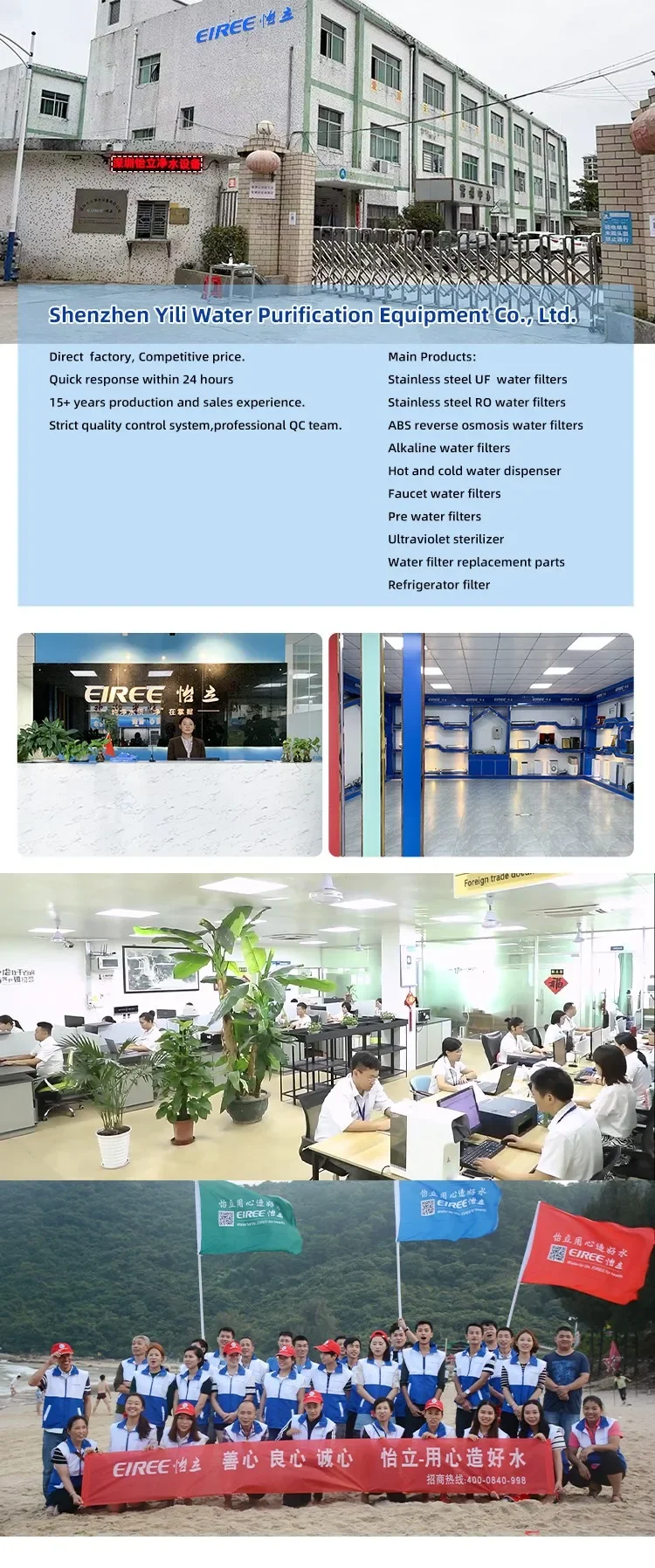 in Shenzhen ,China.founded in 2006 .a leading manufacturer with rich experience in water filtration and purification field. lt carries various residential,commercial and industrial water treatment as well as relevant spare parts .From home use to industry, from little fitting to complete plant project. All systems are CE certified, some even ROHS,CB,CE, FC,,MSDS certified. factory have been certified by TUV, ISO9001.