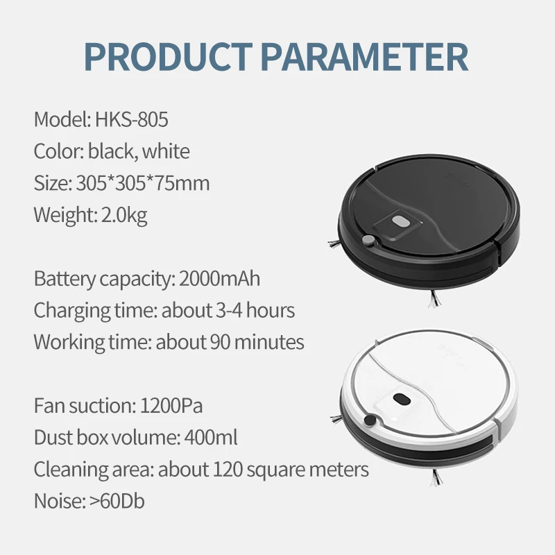 Three-in-one Upgraded Cleaning Robot effortlessly cleans on a scheduled time or with a one button click. Special easy maintenance with tangle-free suction port. Its small body allows you to define the cleaning area. With the combination of triple modes. The slim design allows it to clean under beds and furniture where dirt likes to hide. Smart sensors for anit-bump and anit-fall keep the robot from harming itself and your home. The low noise and high performance Li-ion battery provides up to 100 min of quiet cleaning. It takes 150 minutes to charge.
