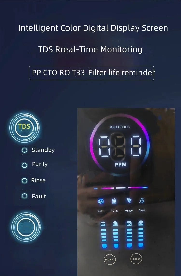 The smart display panel shows the TDS value and remaining life of each filter in real time. The built-in TDS system can accurately monitor the quality of drinking water, just like a caring smart housekeeper. The indicator light serves as a smart reminder assistant, always telling you in time to replace the filter in advance to ensure consistent water quality. With the full set of components included and the clear installation instructions and video tutorials, you can independently complete the installation of the 600GPD RO filter in just a few minutes, and easily start a new era of healthy drinking water.